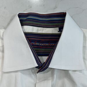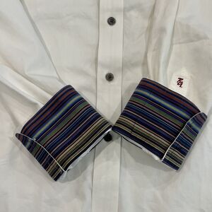 Great Robert Graham quality casual / dress shirt. Has Multi color flip cuffs that is also under the collar. Inside button area is embroidered all the way up and will peek through if you leave the top couple of buttons undone. Easy transition from the office to out for the night.