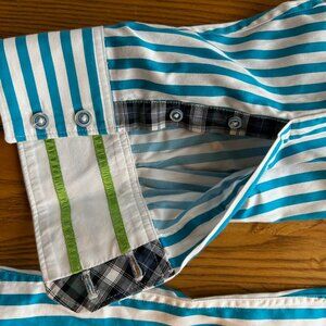 Wide stripes in bright blue with plaid detail on collar, placard and cuffs. Two tone buttons