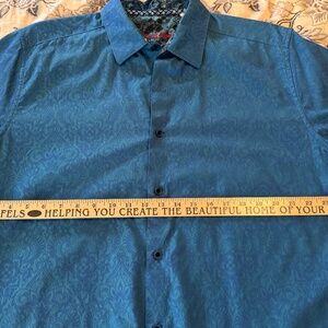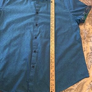 Colors: Light green base with blue paisley throughout shirt