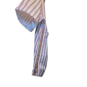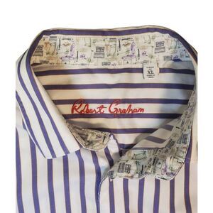 Casual Robert Graham button front short sleeve shirt. Purple stripes outlined in gold. Contrasting print on inside of Sleeve hems and inside of collar. Excellent pre owned condition. Please see photos for measurements, details and condition.