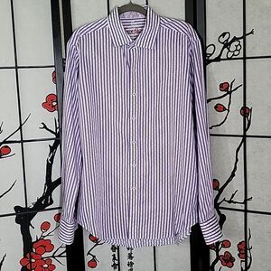 This Robert Graham shirt features a sophisticated purple and white pinstripe pattern, perfect for casual outings. Crafted from lightweight fabric, it offers comfort and style in a classic button-down design. Ideal for adding a touch of elegance to your everyday wardrobe.