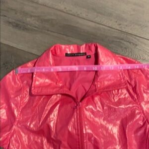 Material is bright pink, almost plastic feeling - has a rain coat feel
