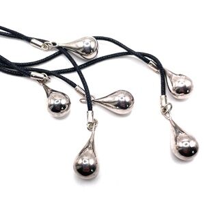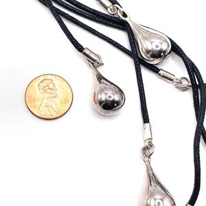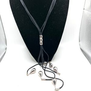 Robert Lee Morris RLM Studio black cord and sterling silver lariat style necklace. Six sterling silver drops dangle from black cord and are held together with sliding silver tube beads in a lariat style necklace. Signed RLM Studio 925 China. From the top to the very bottom of the longest drop is about 21". Pre-owned. Please ask if you have questions.