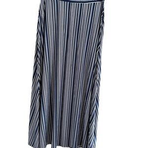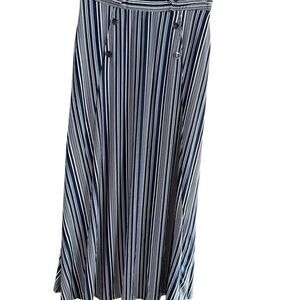 This stylish midi skirt by Robert Louis features a black and white striped pattern with a pleated A-line design. Ideal for both casual and work occasions, it offers a sophisticated yet relaxed look.