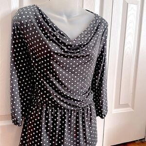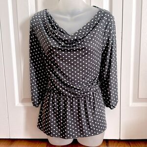Robert Louis Gray Polka Dot Cinch Waist Silky Blouse Medium M Beautiful top in excellent condition. Cinches with elastic for a flattering fit M Medium 29 in pit to pit So silky and comfy Smoke and dog free home (Box 18)