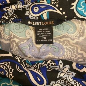 Robert Louis Size Petite Small Long Flowy Maxi Skirt, Black W/ Blue Abstract Paisley Print, Stretchy. Preowned. Nice condition. Waist measures approx 27” and has an elastic, stretchy waistband. Length measures approx 33.5” long. Pretty ruched detailing at the waist.