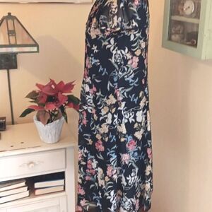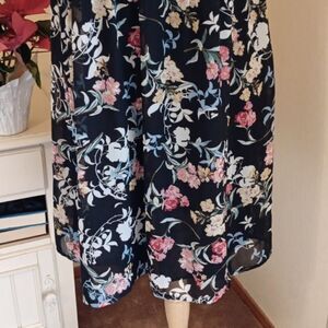 Tucks on bodice. Sheer capped sleeves. Fully lined. Loose shift style. Size S measures 36 at chest, 38 at waist, and 44 at hips. 40 long from shoulder to hem. This dark floral adds drama to a simple design.