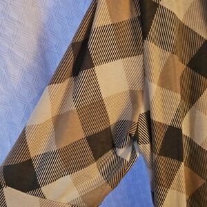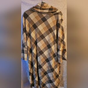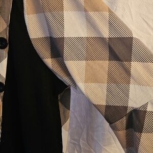 Stylish plaid cape with button front. Features a comfortable hood. Perfect for layering.