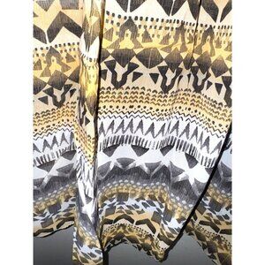 This midi dress features a professional yet stylish design with a geometric mustard and ivory pattern. The button-front and short sleeves add versatility.