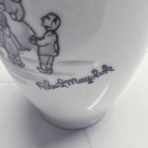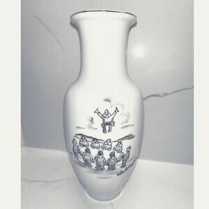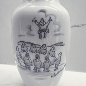 Unusual hand painted porcelain souvenir vase with a signature of Robert Mayokok. Robert Mayokok was a native Eskimo artist who was known for his scenes of life in the Arctic Circle. This line of pottery was made in the 1950s. It appears to be a circle of eskimos holding a trampoline skin with someone jumping. Someone else interpreted it as Jesus ascending from the heavens. You be the judge, Measures 6 1/2" tall.