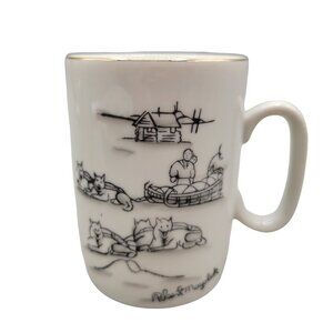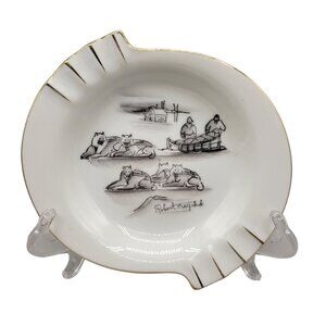 Alaskan native Robert Mayokok set of porcelain pieces. White with gold trim and gray designs by artist Robert Mayokok (1903-1983). Born in Wales, Alaska, he became a painter of subjects depicting his culture. Each item includes his signature. Made in the 1950s.