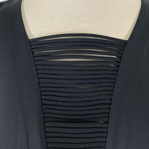 Show out in this daring black stretch silk jersey midi length wiggle/pencil dress. 3/4 dolman sleeves add interest, but all eyes will be on the risqué deep plunging neckline filled in with horizontal strips.