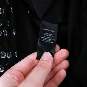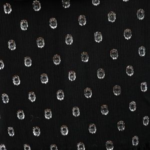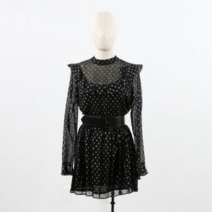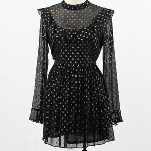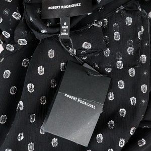 Angelic black doll dress by Robert Rodriguez. Lightweight textured layered semi sheer silk chiffon mini. Lined relaxed fit & flare short dress. Long flutter sleeve w ruffle cuff. Embellished w metallic thread gold silver polka dot print. Flirty fun babydoll - VERY cute in person. Holiday party ready! NWT