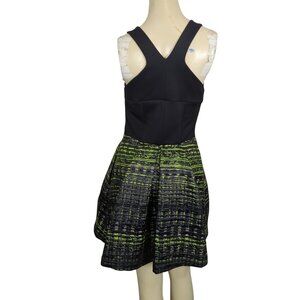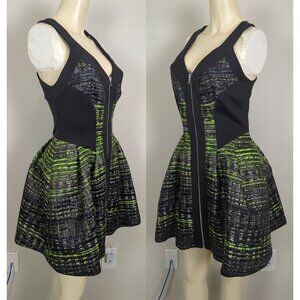 This Robert Rodriguez dress combines a sleek silhouette with a vibrant neon green and black textured pattern. The zip-front detail adds modern flair, while its fit-and-flare design ensures a flattering look.