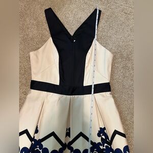 This elegant dress features a sophisticated black and cream design with striking blue accents. Perfect for any occasion, it combines style and comfort effortlessly.