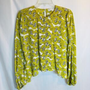 Brighten your wardrobe with this Y2K-inspired Robert Rodriguez blouse in a vibrant yellow floral print. Features long sleeves with opening and ruched drawstring cuffs, an asymmetrical hem, and a flirty open-back detail with layered draping. Made from lightweight 100% polyester — perfect for spring or summer layering. Ideal for pairing with vintage denim or high-waisted trousers for a trendy, retro look. Size Small. Dry clean recommended.