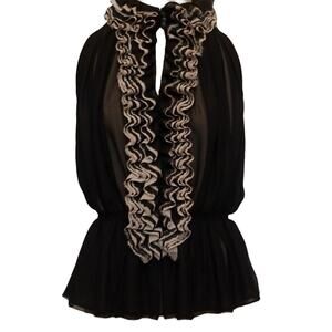 Beautiful blouse in black and nude with a ruffled edge at the bodice and neckline . closes with 3 buttons at the neck or can leave it open.