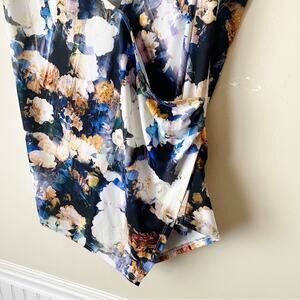 Features: Francine blouse top, cap sleeves, watercolor floral Shadow Blossom print, draped neckline, faux wrap detail in back with asymmetrical hemline, 100% polyester, office, business casual