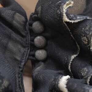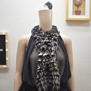 V neckline; cascading ruffles with scalloped lace.