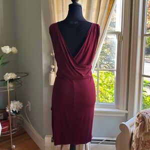 Stunning and sophisticated Robert Rodriguez dress in a rich deep-wine shade. Features a plunging draped neckline that's subtly lined with sheer mesh, gathered shoulders, and a signature twist-knot detail at the waist that creates a super flattering silhouette. Soft, stretchy jersey fabric makes it comfortable while still looking elevated.