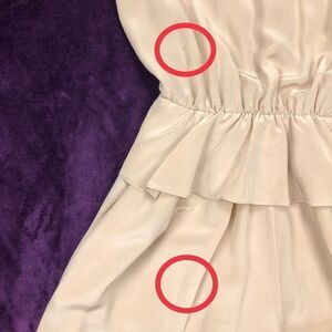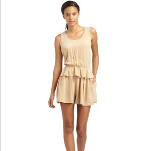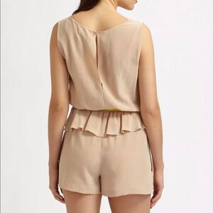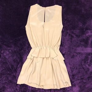 Super cute pre-owned Robert Rodriguez Nude Light Tan Silk Peplum Sleeveless Romper Jumper Size 4. Has pockets! Two very small stains on front, circled in pic. Freshly dry cleaned. Elastic waist, super stretchy! Please ask all questions before purchasing.