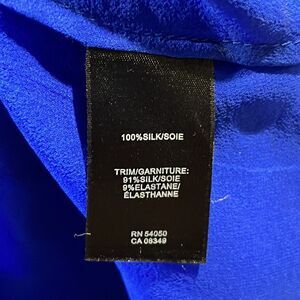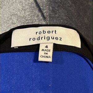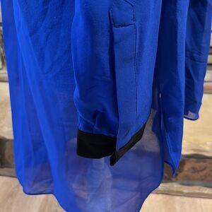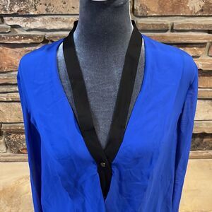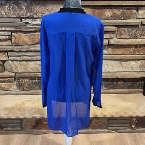 Robert Rodriguez sheer silk blue and black long sleeve blouse. Stretch silk fabric is lightweight and semi-sheer. Blue body with black trim. Draped collar detail. Gently used preowned condition, see photos. Most items ship next business day.