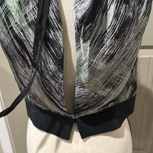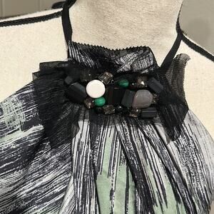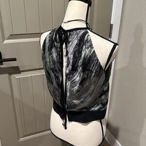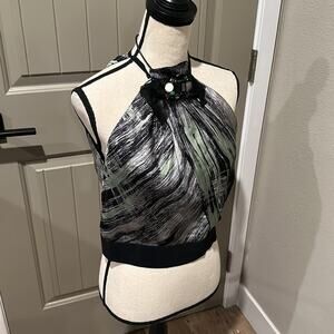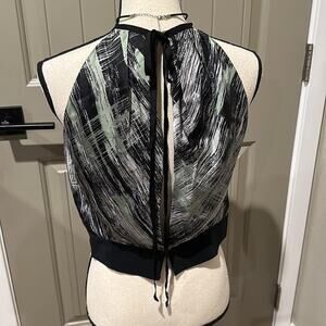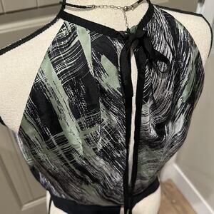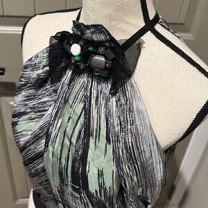 Robert Rodriguez Multicolor (green/black) Abstract Top. Material 100% Silk. Sleeveless, Halter top with lace and bead embellishments. Size 4. Size/care tag removed. Great, like new condition. Measurements in photos.