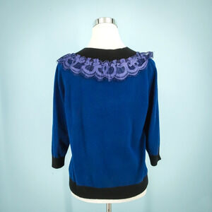 Robert Rodriguez Size Medium M Blue Black Lace Trim Button Front Down 3/4 Sleeve 100% Cashmere Knit Cardigan Sweater- Style R806K08