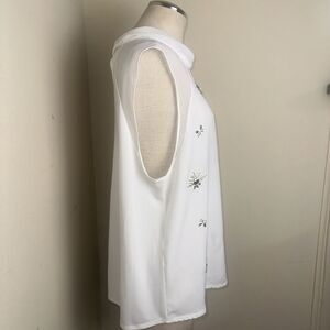 This Robert Rodriguez blouse is a beautiful classic white tunic that features stunning beaded accents. It is designed to be an evening wear top, but it is also great for casual events. The blouse is sleeveless and has a collared neckline. It is a size L and is made of quality polyester material. The blouse is also sheer, giving it a glam look. The blouse is an EUC and one can be confident that they will get a good quality blouse. Get this blouse today and enjoy the quality!