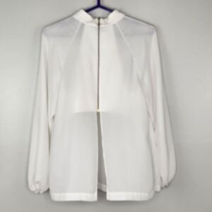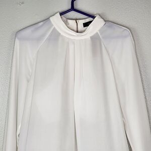 Gorgeous white chiffon high neck, long sleeve elastic cuff blouse with built-in halter bra, back zip, and back split from Robert Rodriguez! Would go perfectly with the Robert Rodriguez culottes I have for sale! Tiny dot on back of sleeve should come out.