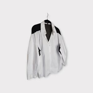 Tags: colorblock blouse, black white contrast, sheer back, tailored fit, statement top, graphic contrast, minimal edge, structured blouse, elevated neutral, day to night
