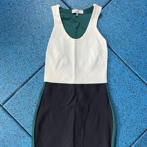 Stretch material, side cutouts. color block forest green, white and black. flattering!