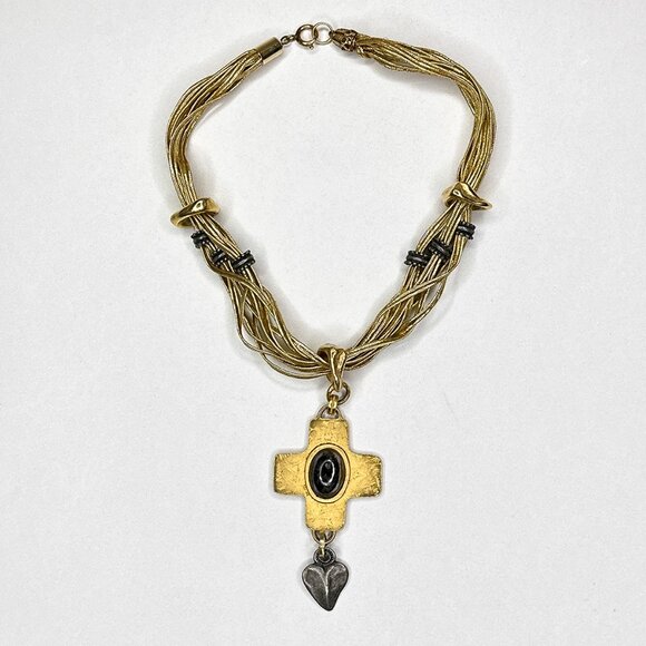 Robert Rose Faux Gold Cross Necklace Oval Stone Heart Multi Strands Length 14"