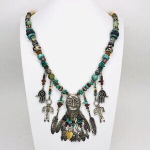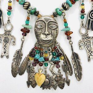 This is vintage Robert Shields SPIRIT fetish mask Necklace Earrings Sterling Silver Turquoise with Southwestern dangling charms and pendants.