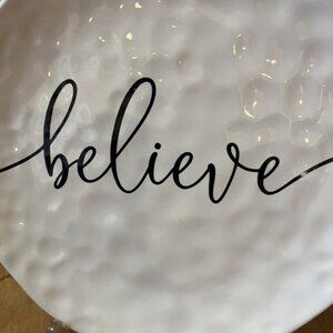 Celebrate the holiday season with this beautifully textured ceramic plate, featuring the word "believe" in a festive design. Perfect for holiday gatherings and as a decorative piece.