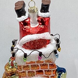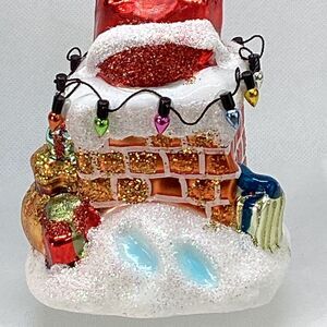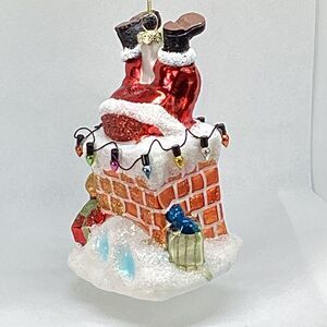 Bring some holiday cheer to your home with this brand new with tags 2020 Robert Stanley Home For Christmas Collection tree ornament featuring Santa coming down the chimney with his boots up! Style #5029236. True to Robert Stanley style, there is no lack of whimsical detail - glitter on Santa's suit, colorful lights around the chimney, glitter and presents - lots of sparkle make this a wonderful ornament for your tree.
