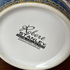 Robert Stanley coordinating Christmas plate and mug. The ceramic set features blue and gold colors and scalloped edges. The holiday design includes a sleigh, a teddy bear and nutcrackers. These pieces are in good pre-owned condition with minor wear. Microwave and dishwasher safe.