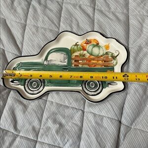 Fall trinket tray / tableware old green pickup truck with pumpkins leaves fall design. Robert Stanley for hobby lobby fall / joyful collection. Food safe, hand wash only not microwave safe. I love to bundle!