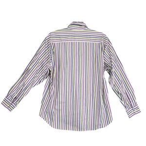 * Features: Long sleeves with button cuffs, single pocket, collared neckline, button front closure, curved hemline. Vertical stripes in white, blue, lime, navy, orange and purple.