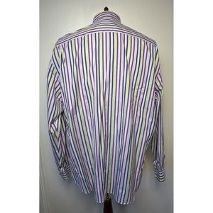 Robert Talbott Carmel men's size XL shirt is in excellent condition. White shirt with stripes of purple, green, grey and gold with seven-button front. Collar is button-down with hidden buttons. Long sleeves with two-button cuffs and placket button. Shirt tail hem. Two extra buttons.