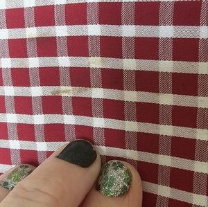 Flaw: It's mostly great condition, but there is one stain on the upper shoulder on the back. Picture of stain shown in photos.