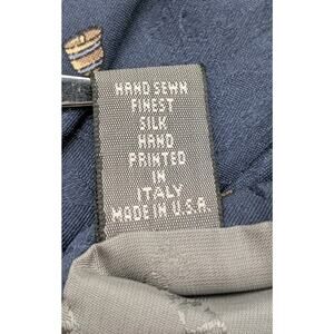 Add a festive touch to your holiday wardrobe with this vintage Robert Talbott Christmas necktie, made exclusively for Jacobson's. This tie features a beautifully detailed Santa Claus design with children, toys, and holiday bells on a navy blue background. Made from the finest silk, hand-sewn, and hand-printed in Italy, this tie is crafted in the USA.