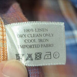 This one looks sharp! Linen may not be as soft as cotton, but it just looks so rich. This guy is quickly becoming one of my favorite designers for men's clothing. The sleeves are always plenty long, whereas that can sometimes be a problem with other shirts that only claim "large" or "extra large." Yes, I"m a woman, but I have been dressing 3 men for many years. :) Their standard semi-spread collar, left breast pocket, and darted back. Excellent condition.