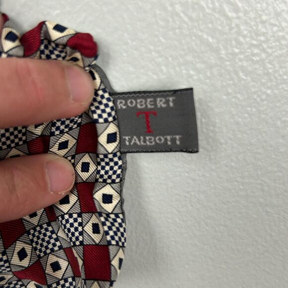Elevate your style with this Robert Talbott tie. Made of high-quality silk, this hand-sewn tie features a vibrant red color with a geometric pattern that adds a touch of sophistication to any outfit. The classic length (57"-60") and wide width make it a versatile accessory that can be worn for any occasion, whether it's a wedding, a business meeting, or a day out in the city. This designer tie is a must-have for any fashion-conscious man who wants to make a statement. The tie is made in the United States and reflects the luxurious style that Robert Talbott is known for. Add this tie to your wardrobe and elevate your look to the next level. A few minor blemishes. See all photos before buying.