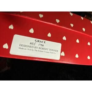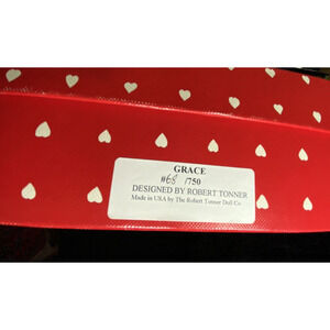 Grace doll comes in the older-style box, identified by its red color with white hearts, dating back to 1994. Carefully removed for back pictures. Her purchase card remains unfilled, adding to her pristine condition. Complete Grace dolls are increasingly difficult to find.