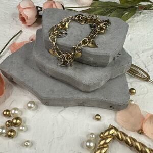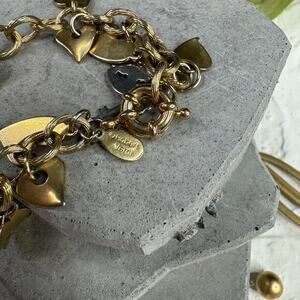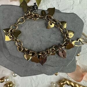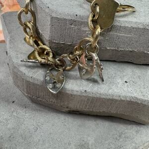 Gold toned with silver lock and key detail charm bracelet by Robert Verdi. Hearts all over, all shapes and sizes. Stamped with Robert Verdi. Lobster clasp.