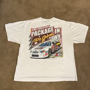 The Robert Yates Chase Racing Tee featuring Dale Jarrett's 88 UPS car is an officially licensed NASCAR shirt in size Large. This men's white shirt represents the Robert Yates Racing team and is perfect for fans of auto racing and specifically, NASCAR. Show off your support for Dale Jarrett and his iconic racing design with this stylish and comfortable shirt.