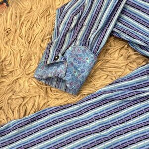 Robert Graham button down striped shirt XL. It’s a great looking shirt, but there is some yellowing at the collar. Needs a good dry clean.