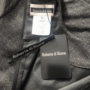 Roberta Di Roma dress in black fabric with silver thread creates a beautiful shimmer, while the ruffles and feather detailed bottom add a playful element to the knee-length classic A-line style. Round neckline, long zipper in the back, bracelet length sleeves, and black lining. Polyester/ Spandex/ Silver thread Machine wash cold. Chest 30 Inch, Sleeve length 19 Inch, Dress length 37 Inch measured in the back. NEW with Tag Size S