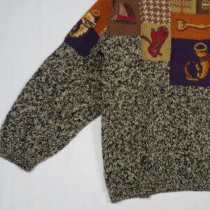 Step into a world of cozy charm with this Roberta Frost hand-knitted sweater, a wearable piece of art that tells a story with every stitch. A captivating patchwork design showcases an array of Western-inspired motifs, from cowboy hats and horseshoes to ropes and other rustic elements, creating a visually stunning and conversation-starting garment. The neutral-toned, speckled knit provides a warm and inviting texture, while the high neckline adds a touch of sophistication and warmth. This sweater is not just a garment; it's an experience, wrapping you in comfort and style. Perfect for a casual weekend outing, a cozy evening by the fireplace, or adding a touch of whimsy to your everyday wardrobe.